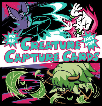 Creature Capture Cards is a wholesome procedure based TTRPG about exploring the world, making friends and capturing monsters. Creature Capture Cards can be played with a GM and up to 4 players, but it can also be played solo, or collaboratively without a GM. This game requires the use of both books, Tarot Cards and D10's.