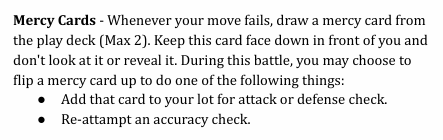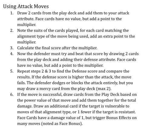 After a successful Gencon handing out flyers I've finally been able to do some extensive playtesting with people, and as a result I've made some small changes to the combat system. This is a small change to how cards are drawn when attacking and defending. This change serves to make the card combat less complicated while also making low attributes significantly less terrible.